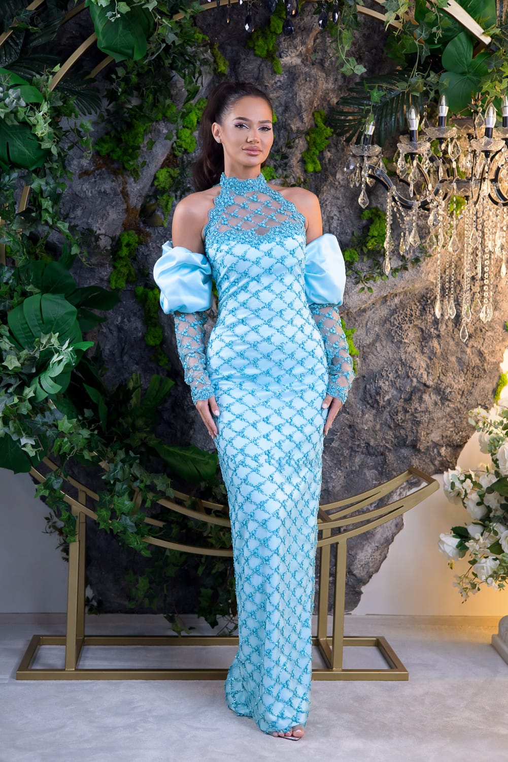 Rochia Aqua Celestia surprinde prin eleganța ei sculpturală și culoarea albastru-cristalin, care amintește de reflexele apei în lumină. Partea superioară, realizată din dantelă delicată cu aplicații fine, creează un efect sofisticat, completat de gulerul înalt ce alungește frumos linia gâtului. Mânecile bufante din satin adaugă volum și rafinament, în timp ce brațele rămân acoperite cu broderie transparentă, pentru un contrast spectaculos. Silueta lungă și suplă conferă rochiei un aer regal. Modelul poate fi modificat pe mărimile S și M pentru o potrivire ideală. Este o rochie creată pentru evenimente în care vrei un look cu adevărat memorabil.